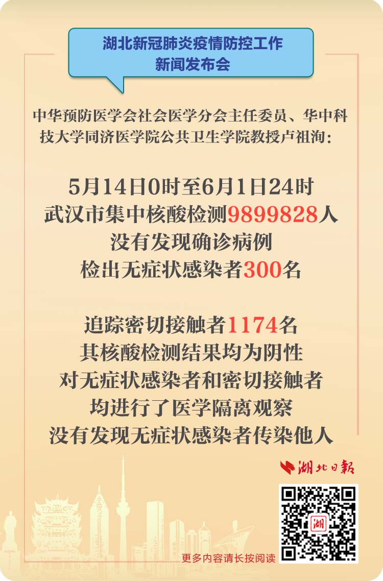湖北日报讯(记者胡蔓、龙华、李源)6月2日,湖北省新冠肺炎疫情防控指挥部召开第104场新闻发布会。会上,湖北日报全媒记者获悉,从5月14日0时至6月1日24时,武汉市集中核酸检测9899828人,没有发现确诊病例,检测出无症状感染者300名、检出率为0.303/万,追踪密切接触者1174名,其核酸检测结果均为阴性,对无症状感染者和密切接触者均进行了医学隔离观察。