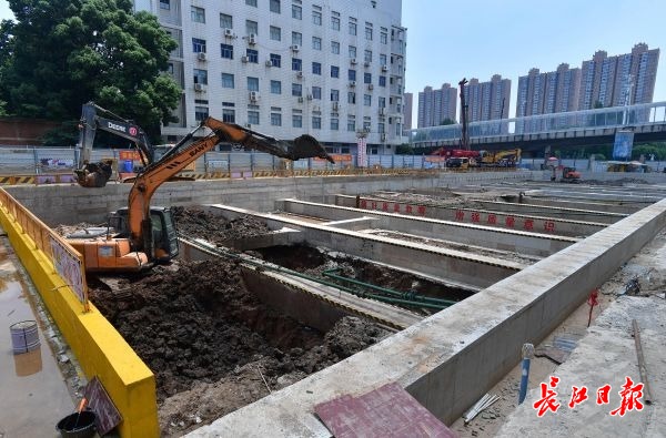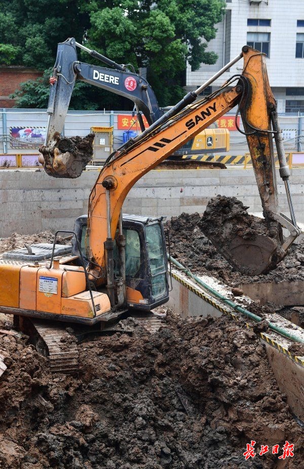 2日,长江网记者在现场看到,多台挖机正在开挖车站的地下土方,卡车则配合将泥土运输到项目部的一处专门存放处,时值中午时分,工地上仍然是一片繁忙的景象,机器设备、人员运转有条不紊。