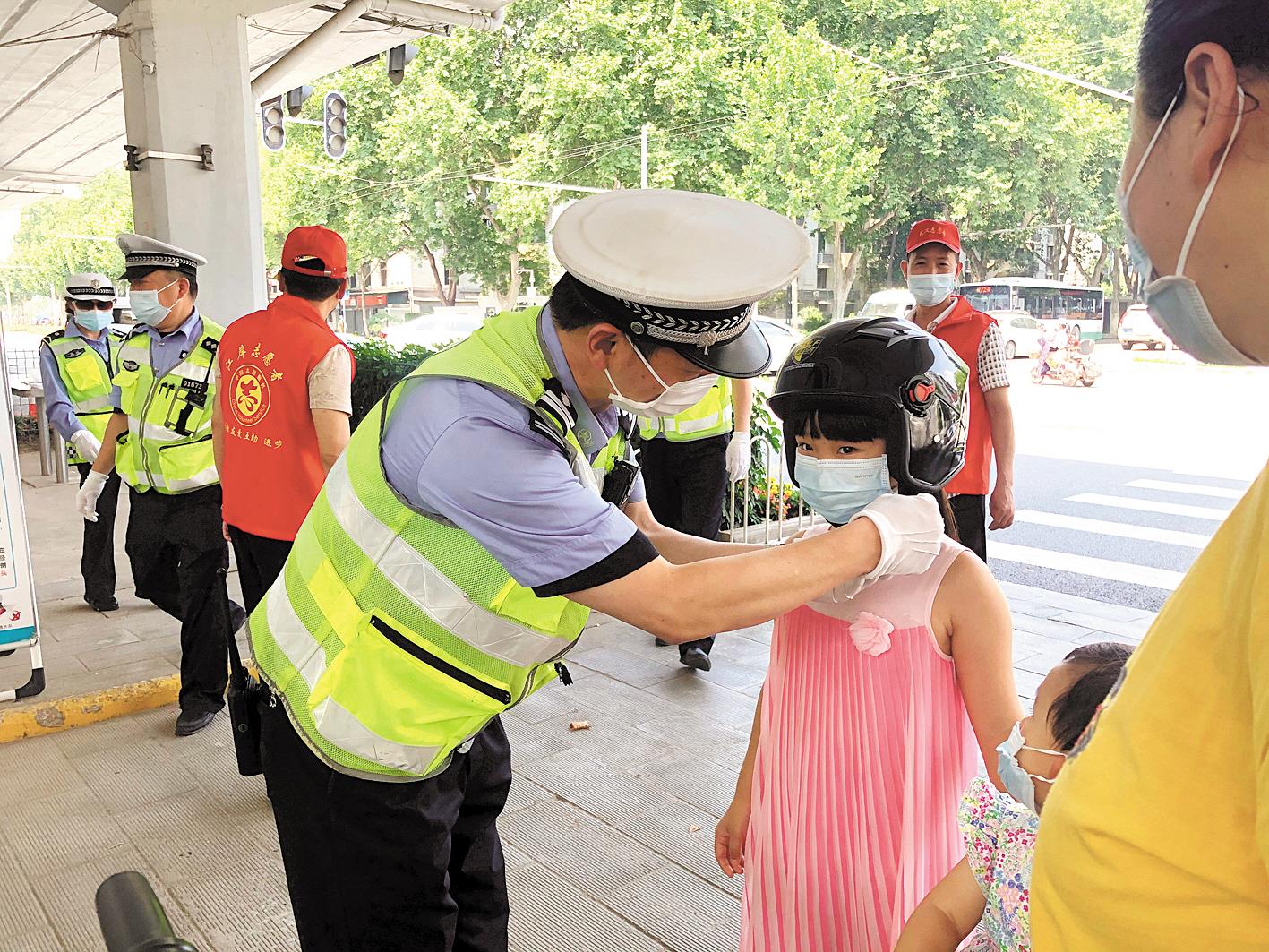 交警为小朋友戴上安全头盔。 (视界网 高航 摄)
