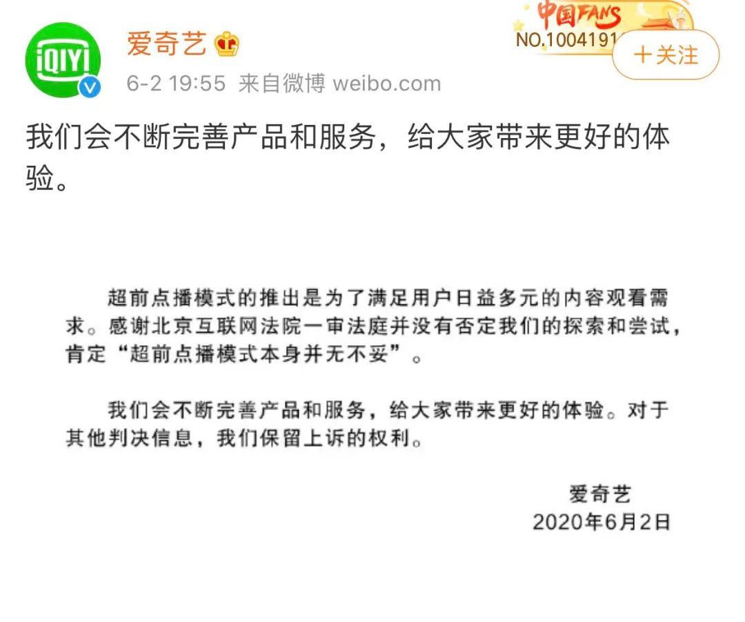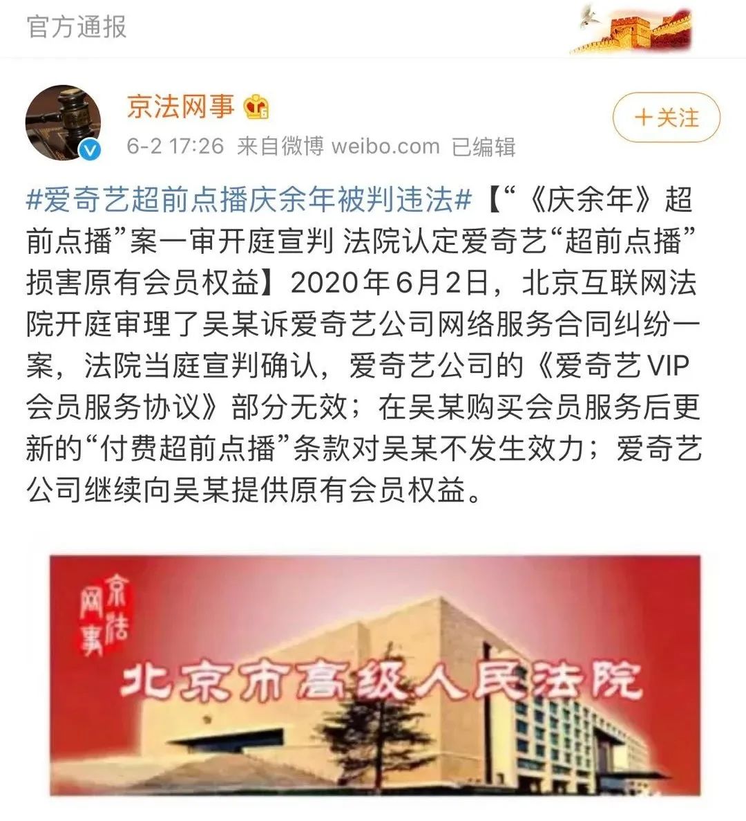 在判决中,针对大家最为关心的“超前点播”行为是否违法,法院表示,确认《爱奇艺VIP会员服务协议》(更新时间为2019年12月18日)第3.5条中“超前点播剧集,根据爱奇艺实际运营需要,就爱奇艺平台上部分定期更新的视频内容,爱奇艺将提供剧集超前点播的服务模式,会员在进行额外付费后,可提前观看该部分视频内容的更多剧集,具体的点播规则以爱奇艺平台实际说明或提供为准”对原告吴某不发生效力。