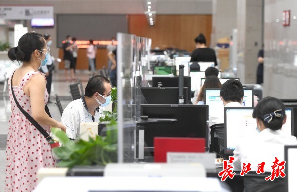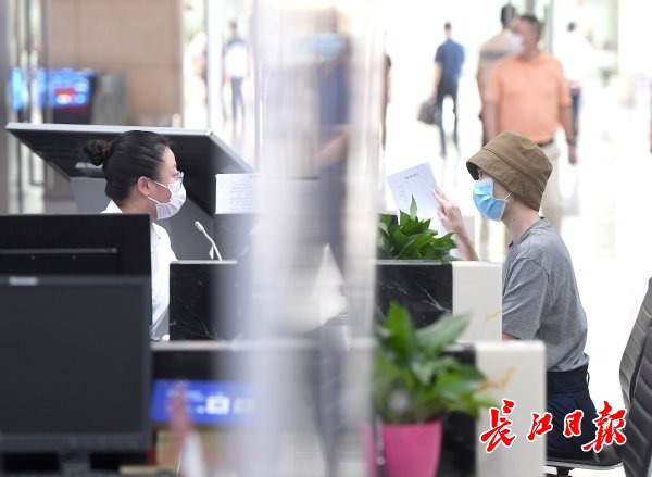 长江网6月3日讯 6月2日,在武汉市民之家,大厅内所有办事窗口都安装了透明玻璃隔板,市民通过隔板办理相关业务。 (记者周超 摄影报道)