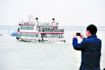 看着汽渡船离去,居民拍照留下记忆。
