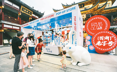 5月22日,汇聚50余家老字号品牌和大批国潮新品的“国潮老字号”游园会在上海豫园商城开幕。图为5月24日,市民在游园会的大白兔快闪店前拍照。