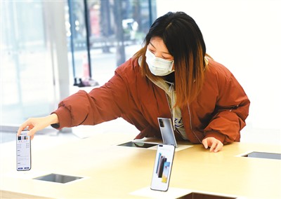 今年一季度,国产品牌华为推出5G旗舰手机P40系列,吸引了不少市民前来体验。图为顾客在位于杭州的华为旗舰店内体验P40系列手机。