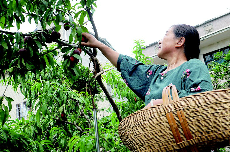 门前,便是赵全英和老伴打理的菜园了。西红柿已长出青果,黄瓜、四季豆挂满了架子,丝瓜花开了;玉米高过人头;辣椒绿油油、茄子叶子肥茂;红薯苗才冒头,间种的西瓜苗藤蔓伸展一米长。果树上,柚子、橘子树上挂满了未熟的果子,到了秋天,就会变黄变红。樱桃、枇杷树果季已经结束,绿叶在风中翻动。