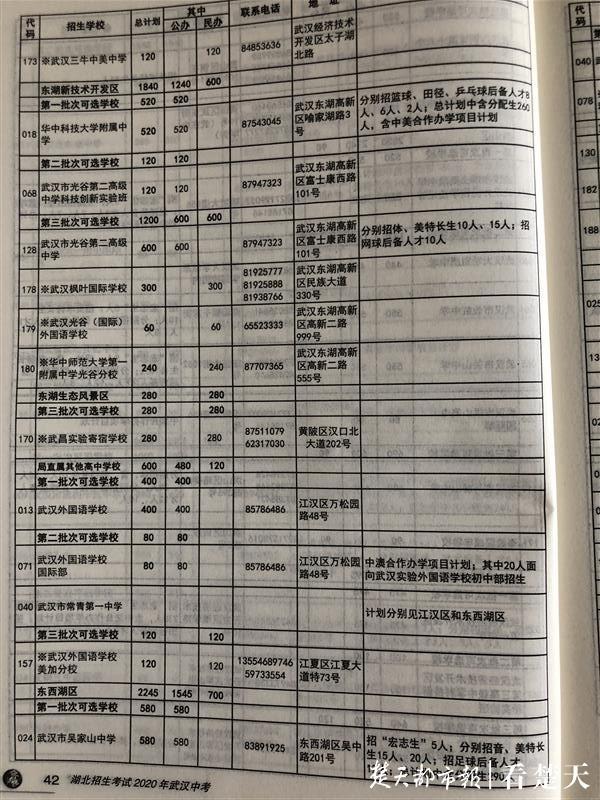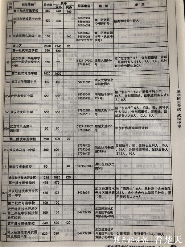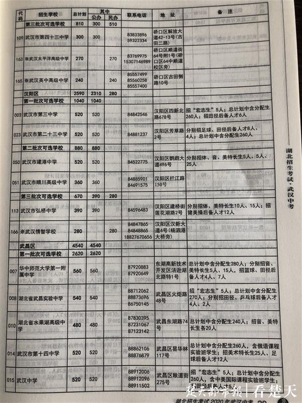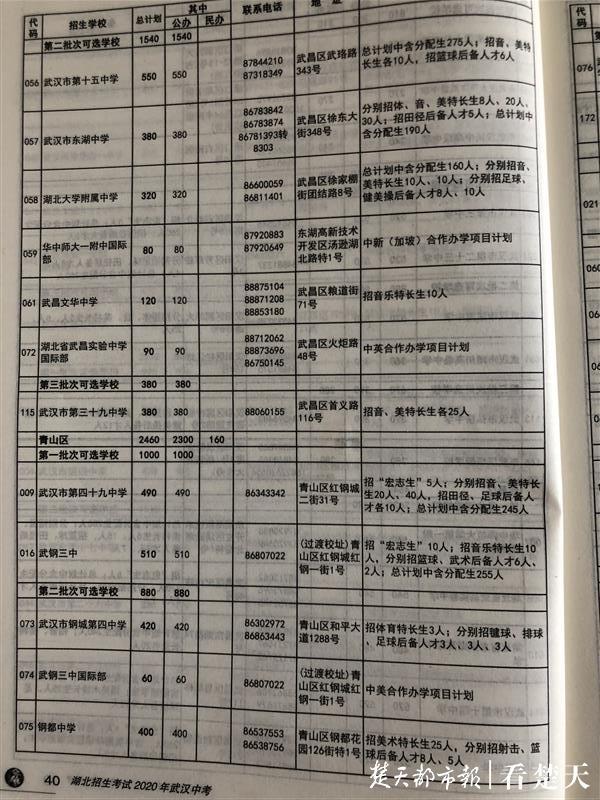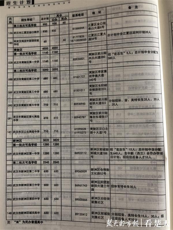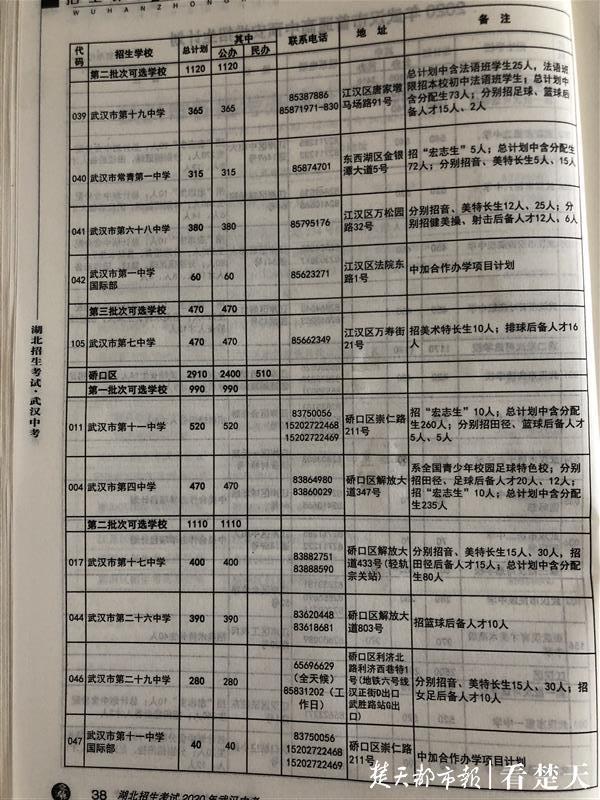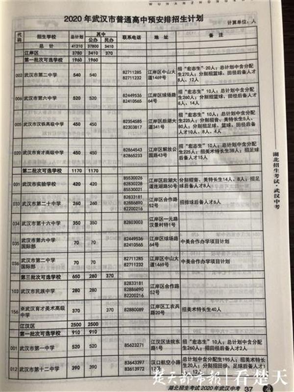 5日,武汉市2020年普通高中预安排招生计划出炉:全市普通高中计划招生4.12万人,比去年增加约0.2万人。其中,省级、市级示范高中计划招生3.4万人。据测算,今年初中毕业生就读优质高中的比例约为46%,与往年持平。