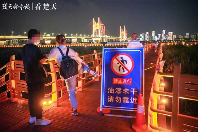 楚天都市报6月5日讯(记者刘中灿 实习生付豪)晚8点,夜幕降临,汉口江滩芦苇荡上的观芦栈道前来了一波又一波观赏夜景的市民,不巧的是进入观芦栈道的一个入口拉起了警戒线,上面标识有“油漆未干,请勿靠近,禁止通行”字样。接近一半的观芦栈道没有开放,但为了欣赏美丽夜景,很多市民钻过或跨过警戒线,径直入内。