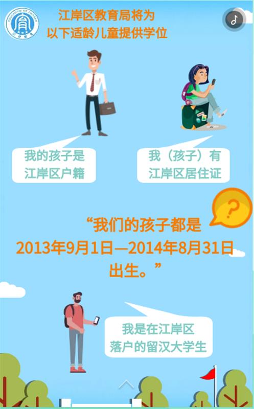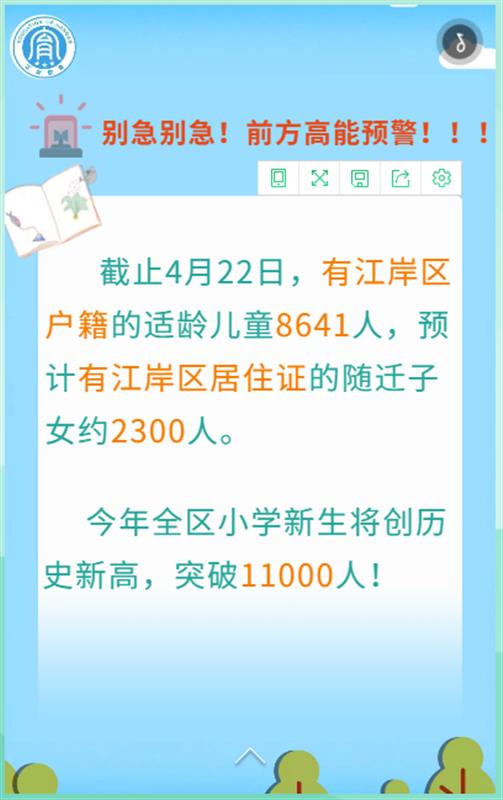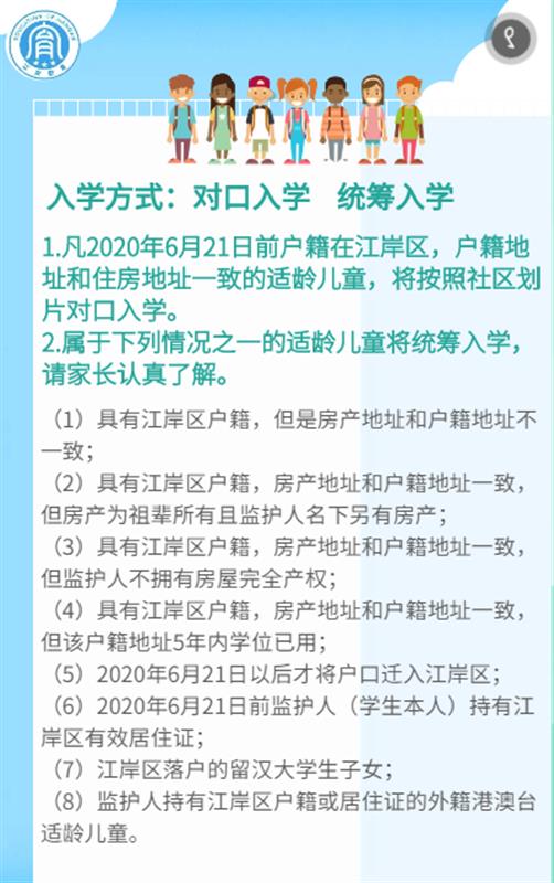 据了解,截止4月22日,有江岸区户籍的适龄儿童8641人,预计有江岸区居住证的随迁子女约2300人。今年全区小学新生将创历史新高,突破11000人。依据相关政策,户籍不在江岸区、未持有江岸区有效居住证的随迁子女,将无法安排以下情况的适龄儿童入学。