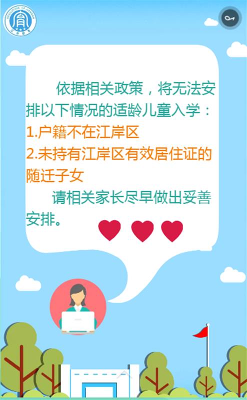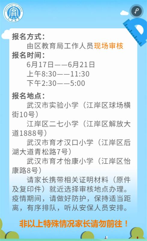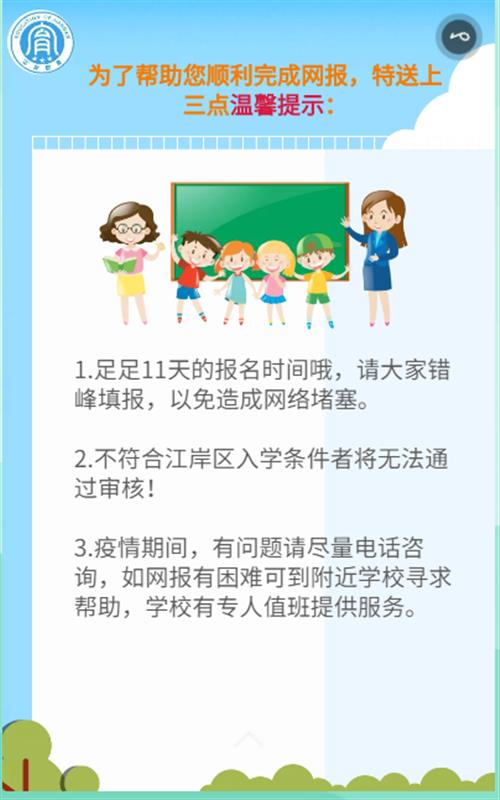 江岸区教育局提醒,此次报名有11天时间,请家长错峰填报,以免造成网络堵塞。不符合江岸区入学条件者将无法通过审核。疫情期间,有问题尽量电话咨询,如网报有困难可到附近学校寻求帮助,学校有专人值班提供服务。