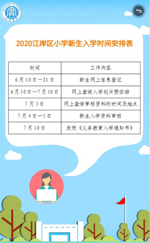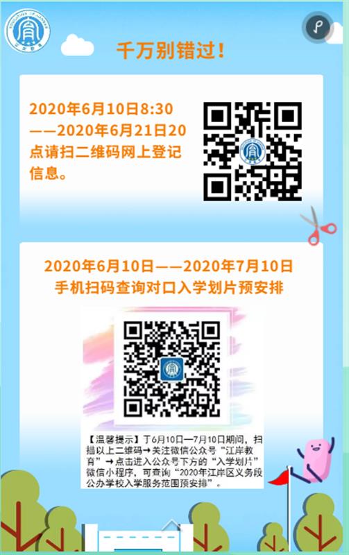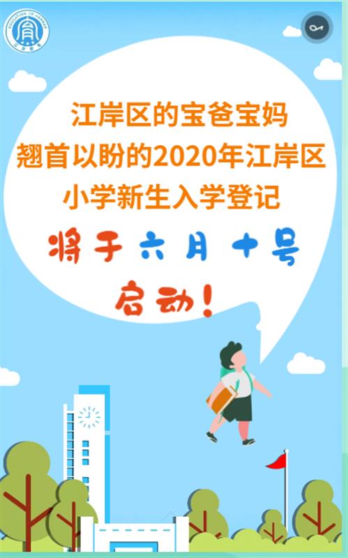 楚天都市报6月6日讯(记者国倩 通讯员杨国涛 胡蕴芬)今日,记者从武汉市江岸区教育局获悉,今年江岸区小学新生入学登记将于6月10日启动。6月10日8:30至6月21日20:00为网上登记信息时间,6月10日至7月10日,家长可查询对口入学划片预安排。