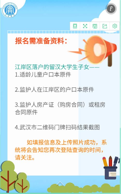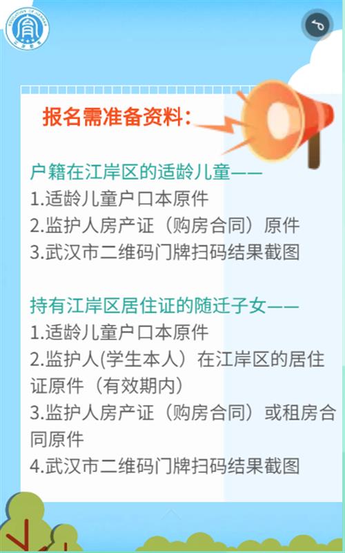 户籍在江岸区的适龄儿童需准备:适龄儿童户口本原件、监护人房产证(购房合同)原件、武汉市二维码门牌扫码结果截图。持有江岸区居住证的随迁子女需准备:适龄儿童户口本原件、监护人(学生本人)在江岸区的居住证原件(有效期内)、监护人房产证(购房合同)或租房合同原件、武汉市二维码门牌扫码结果截图。江岸区落户的留汉大学生子女需准备:适龄儿童户口本原件、监护人在江岸区的户口本原件、监护人房产证(购房合同)或租房合同原件、武汉市二维码门牌扫码结果截图。