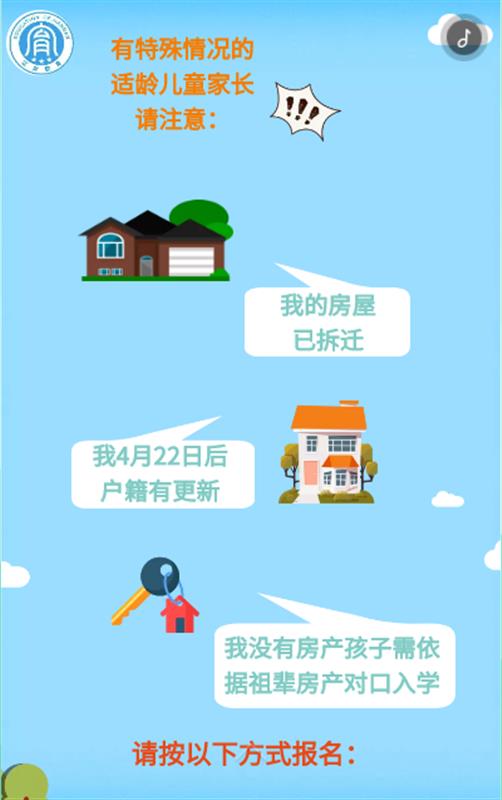 有特殊情况的适龄儿童家长请注意:房屋已拆迁、4月22日后户籍有更新、没有房产孩子需依据祖辈房产对口入学的,家长需携带相关证明材料(原件及复印件)就近选择审核地点办理,由区教育局工作人员现场审核。