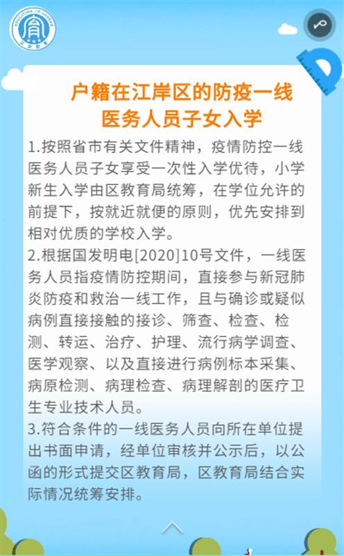 此外,按照省市有关文件精神,疫情防控一线医务人员子女享受一次性入学优待,小学新生入学由区教育局统筹,在学位允许的前提下,按就近就便的原则,优先安排到相对优质的学校入学。