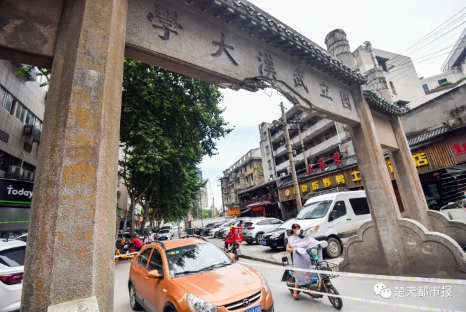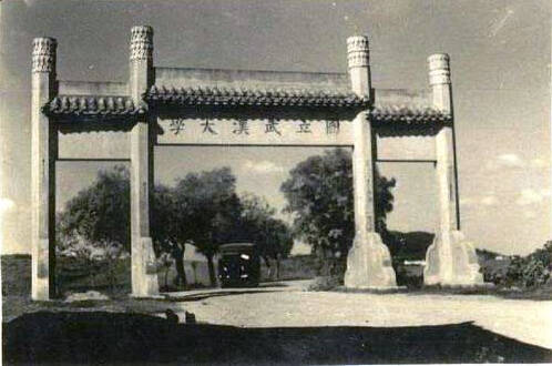 1937年,武大在劝业场原址建造钢筋水泥冲天式牌坊,也即现在的老牌坊。
