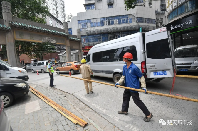 今日下午1时40分,两名安装脚手架的工作人员赶到现场,他们告诉记者,将在现场搭建一个3.8米的脚手架,预计未来两天可将老牌坊修复。