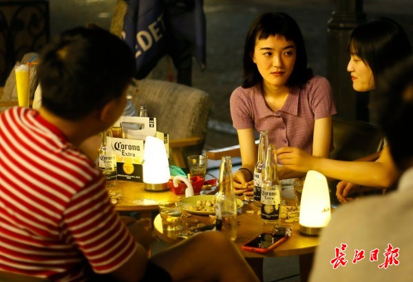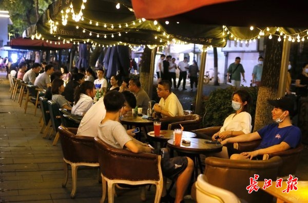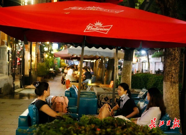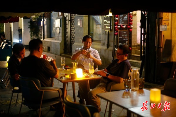 长江网6月6日讯5日晚,600米长的黎黄陂街老街上,大部分特色咖啡馆和酒吧已经恢复营业,在路口的遮阳伞下,人们小聚聊天、打牌,享受休闲时光。记者杨涛 摄影报道