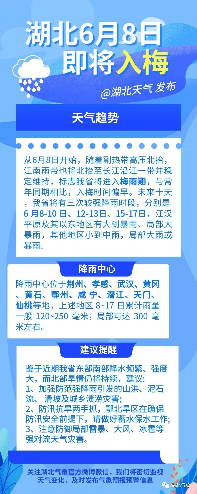 武汉中心气象台宣布,湖北6月8日起将进入今年梅雨期。未来十天,我省将有三次较强降雨时段,降雨中心位于荆州、孝感、武汉、黄冈、黄石、鄂州、咸宁、潜江、天门、仙桃等地,需加强防范暴雨及次生灾害!