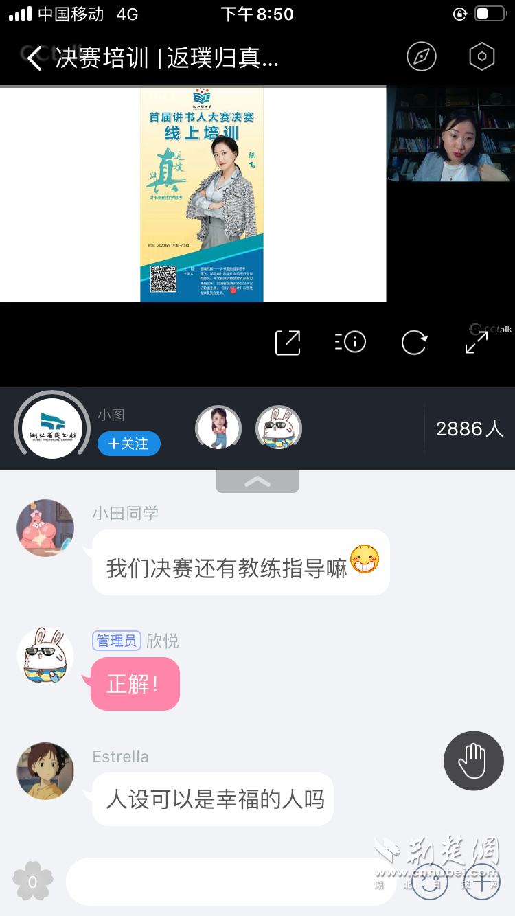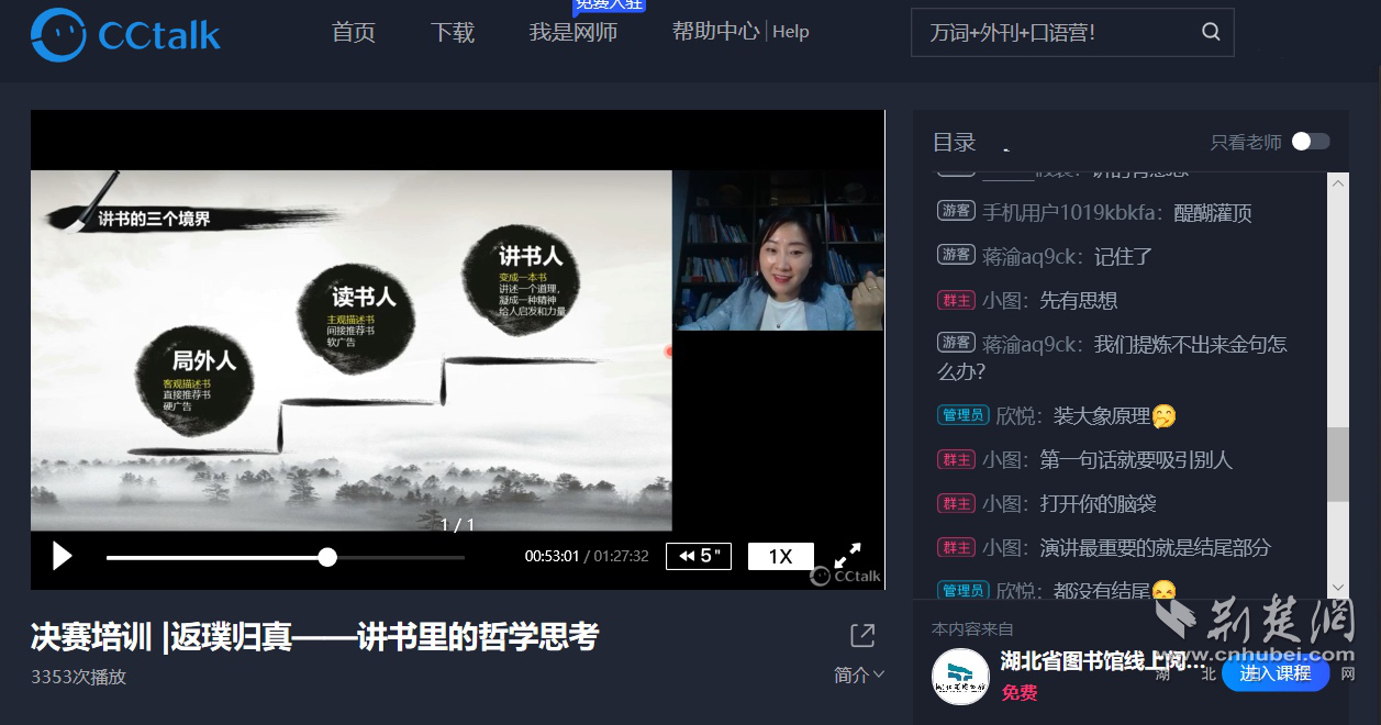荆楚网客户端—荆楚网消息(通讯员刘林玲)首届讲书人大赛历时两个多月,近4000名选手经过初赛、复赛的重重考验,最终100名讲书大咖突破重围,顺利获得决赛的“通行证”。6月5日,讲书人大赛决赛培训“返璞归真——讲书里的哲学思考”线上开播,大赛总教练、湖北省演讲协会副会长陈飞老师从哲学角度解读讲书的内涵和价值,为选手们解锁晋级密码。此次活动荣登CCtalk预约榜第五名,吸引了三千余人观看,并夺得当日热门直播排名第一。