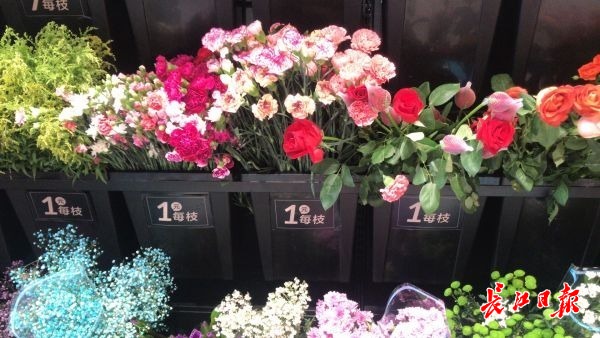 6日下午,记者现场看到,这里鲜花的价格十分便宜。鲜花按枝出售,可供选择的品种很多,价格1元、2元、3元、5元、7元一枝不等。一边逛超市,一边来选购1元一枝玫瑰花的顾客络绎不绝。