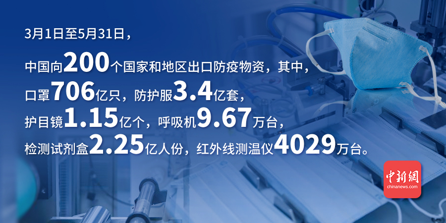 中新网客户端6月7日电 中国今日发布《抗击新冠肺炎疫情的中国行动》白皮书。白皮书指出,3月1日至5月31日,中国向200个国家和地区出口防疫物资,其中,口罩706亿只,防护服3.4亿套,护目镜1.15亿个,呼吸机9.67万台,检测试剂盒2.25亿人份,红外线测温仪4029万台。