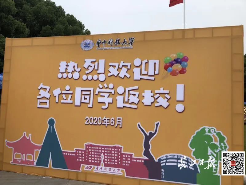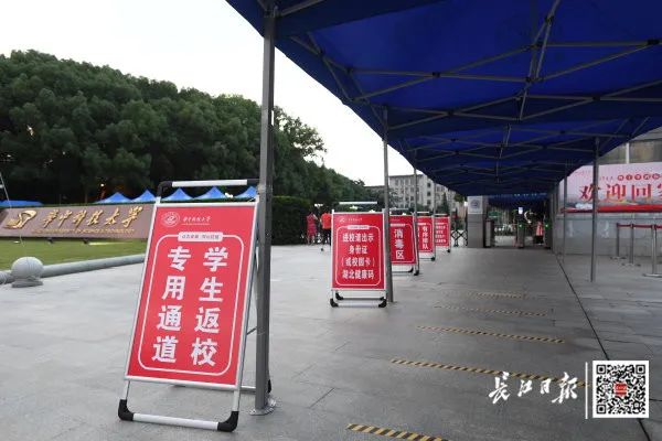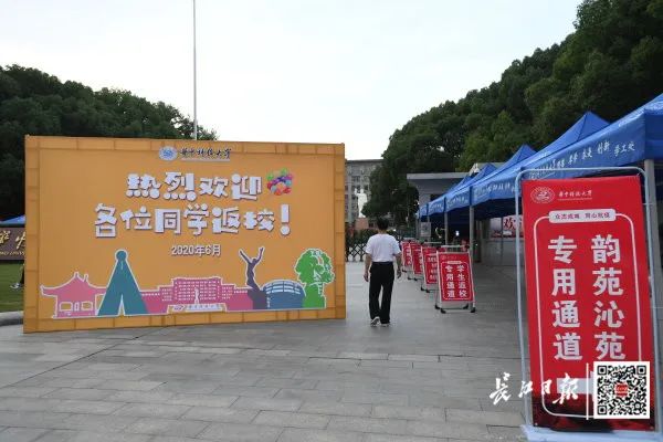 7日,华中科技大学在南门搭起了迎新才有的遮阳棚,“热烈欢迎各位同学返校”几个大字镶嵌在暖色背景墙上,设立专门通道,甚至还搬来电风扇。