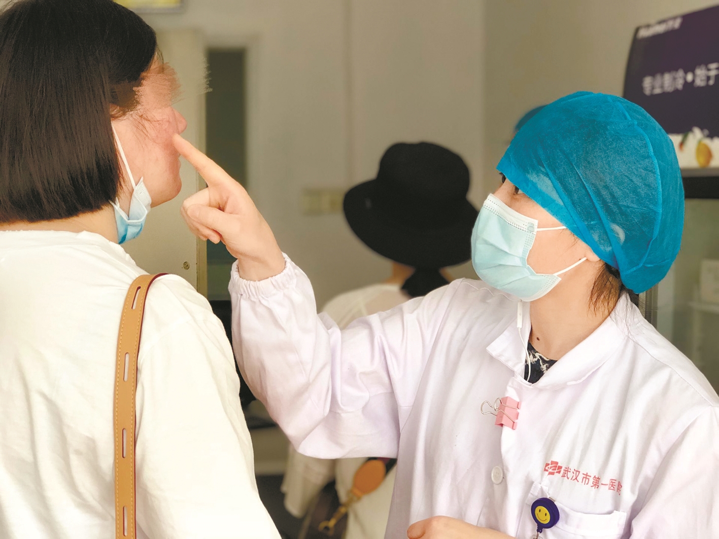 陈柳青主任在为出现化妆品不良反应的患者做检查