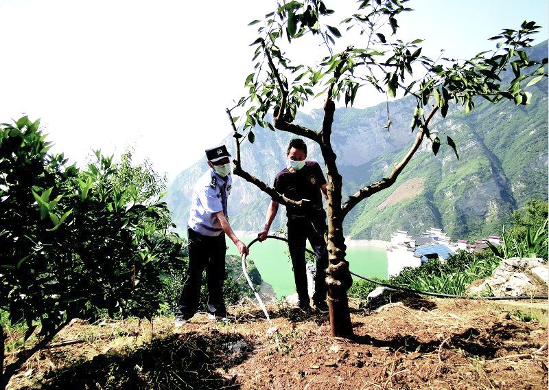 图为民警和果农一起为柑子树浇水。 三峡晚报全媒记者杜勇 摄