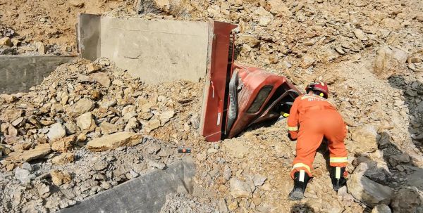 到达现场后,指战员发现此处连日施工造成山体一侧异常陡峭,山体土质脆弱。事发地一辆小货车被山石埋的只露出了一小部分车顶,驾驶室内有一人被困。指战员经询问得知,小货车装卸土方时突遇山体滑坡,导致司机连人带车一起被困。