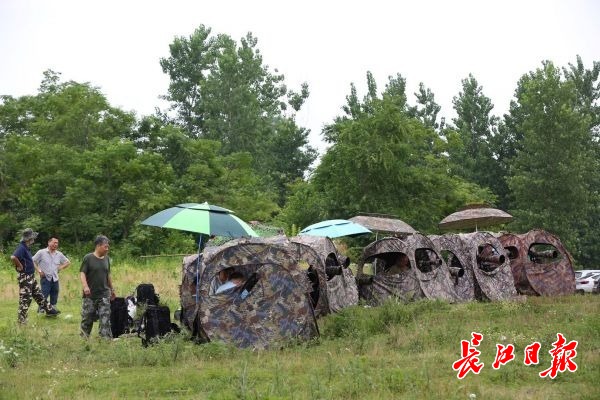 7日上午,沙河河滩一处高地上,10多个迷彩伪装棚一字排开,武汉的20多名摄影爱好者架起“大炮筒”,在棚内“守株待鸟”。据了解,有的摄影爱好者凌晨4点多起床从市区出发,驱车一个半小时赶往目的地拍摄。
