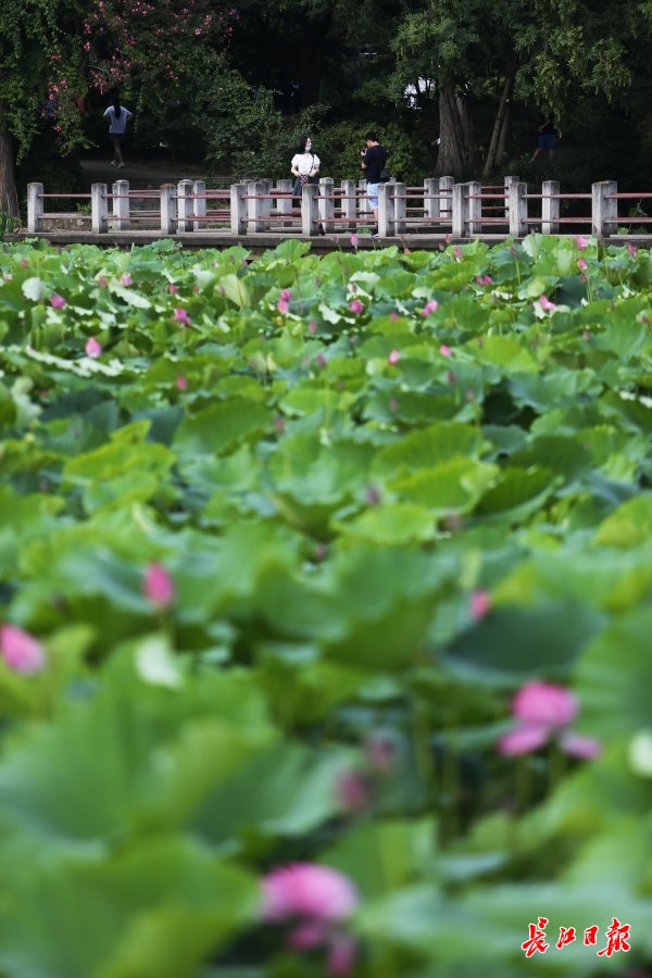 7日,东湖磨山风景区莲花池旁,不少游客赏花游览,欣赏蓝天白云下荷香碧绿的夏日美景。 记者杨涛 摄