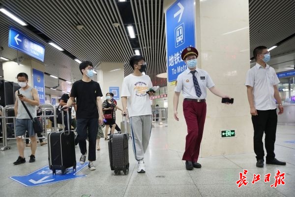 长江网6月8日讯 “太亲切啦,久违的刷卡声、报站声、列车轰鸣声……,一切都是那么的熟悉。”6月8日上午10时许,武汉工程科技学院学生张宁一行两人在汉口火车站下了火车进入地铁站,在工作人员引导下快速进站。张宁说,家在一起的同学两人春节前放假回老家就是“地铁换乘火车”,半年后的今天,再次原路返回,下了火车换乘地铁回学校,“回到武汉真好,回到学校特别开心!”记者了解到,张宁一行这次返汉回校就是清理自己的物品,与母校和同学告别,准备参加工作。