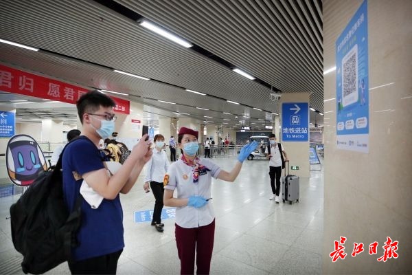 华中科技大学大四学生李晨宇,背着双肩包进入地铁站内,现场工作人员樊岑引导其申领健康码,实名登记扫描乘车码。李晨宇说,“现在的武汉很安全,家人很放心返校。”李晨宇乘坐2号线抵达华中科技大学站,受到了车站工作人员欢迎和帮助。