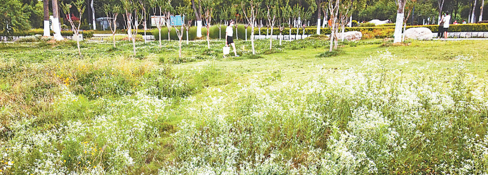 6月8日,墨水湖公园内许多白色的小菊花盛放,不少游客以为其是小雏菊,其实这片花海是菊科飞蓬属的植物,总称为飞蓬草。一朵朵白瓣黄蕊的小花组成了一幅幅清雅秀美的自然美景,吸引了不少市民前来游玩拍照。