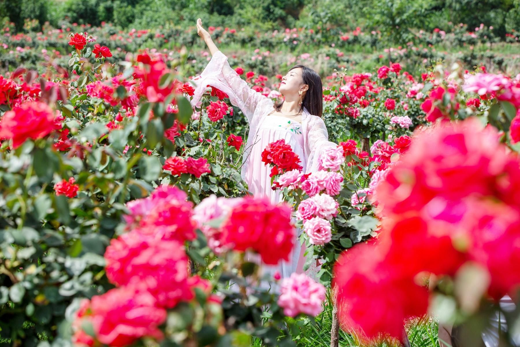 6月6日,游客在襄阳市襄城区卧龙镇朝阳村的卧龙月季花海观赏游玩。4月以来,卧龙月季花海10万多株月季陆续盛开,吸引游人前来观赏、游玩。当地培育的月季园,花期一直持续到11月,长达200天。 (农村新报通讯员 杨东 摄)
