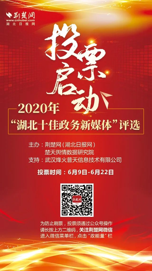 2020年“湖北十佳政务新媒体”评选活动由荆楚网(湖北日报网)、楚天舆情数据研究院主办,支持单位为武汉烽火普天信息技术有限公司。参评对象为湖北各级党政机关、事业单位开设的政务新媒体号,以各单位自荐报名和荆楚网政务新媒体数据库账号为主。