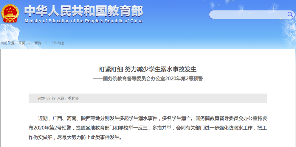 近期,国务院教育督导委员会办公室特发布两次预警,提醒各地教育部门和学校举一反三,多措并举,会同有关部门进一步强化防溺水工作,把工作做实做细,尽最大努力防止此类事件发生。