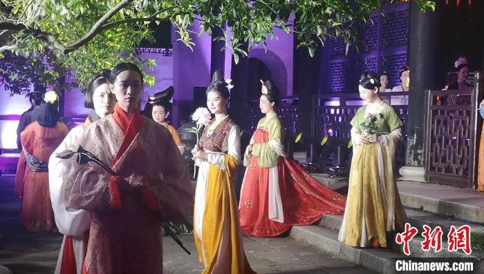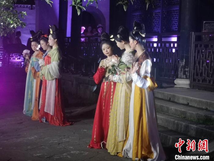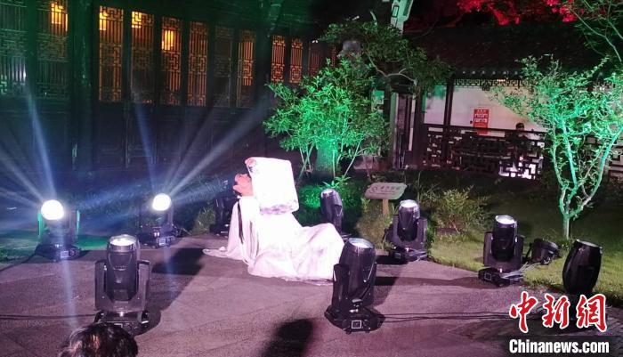 中新网杭州6月9日电(童笑雨)实景园林中还原杜丽娘游园惊梦场景,罗汉堂前身着传统服饰的年轻人坐在蒲团上行飞花令,曼妙身姿在假山上演绎《采薇》独舞……这是专属于浙江省博物馆的“奇妙夜”。