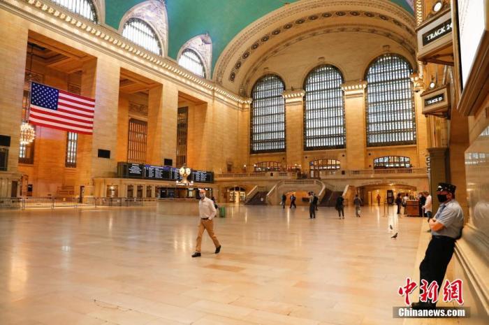 中新社记者 廖攀 摄">当地时间6月8日,行人和服务人员在纽约中央车站大厅。中新社记者 廖攀 摄