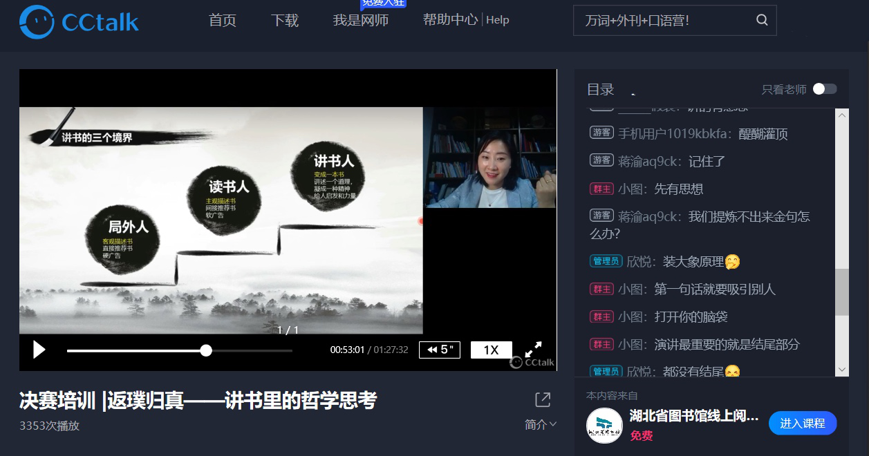 为了帮助大家能够更好地展示自己的讲书才能,湖北省图书馆邀请大赛总教练、湖北省演讲协会陈飞老师,从哲学角度解读讲书的内涵和价值,为选手们解锁晋级密码。“返璞归真——讲书里的哲学思考” 讲书人大赛决赛培训线上开播,此次活动荣登CCtalk预约榜第五名,吸引了三千余人观看,并夺得当日热门直播排名第一。