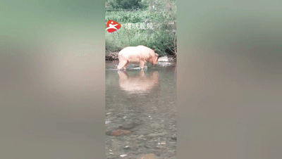 照片中,清澈见底的溪水中央,这头通体金黄的羚牛在水中悠闲地喝水,大大的眼睛圆鼓鼓的,看起来呆萌可爱。