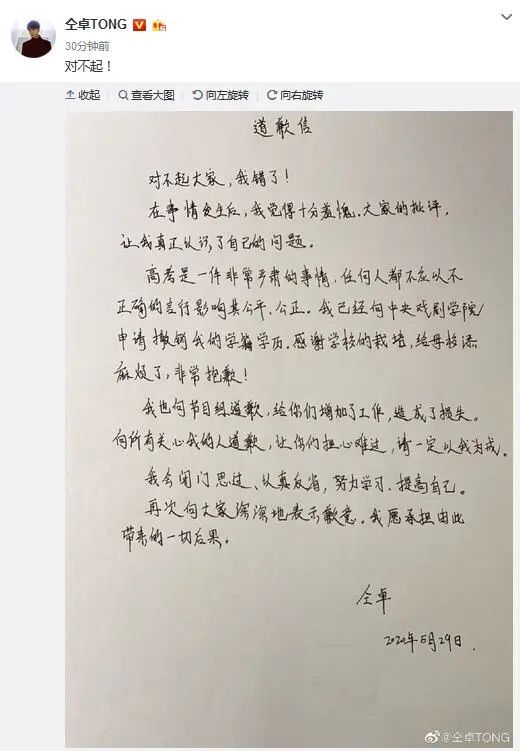 有网友认为,这一行为涉嫌“高考舞弊”。5月29日晚,教育部通过微博回应称,已要求山西省教育厅、有关高校和中学开展调查。同时,仝卓本人也通过其微博发布手写道歉信。称其已向母校中央戏剧学院申请撤销其学籍学历。