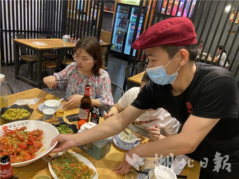 图为:6月3日晚,在东莞市金锡路的“醉美小龙虾”餐厅内,松滋小伙儿郑海洋说:“忙起来很充实。”(湖北日报全媒记者邓伟摄)
