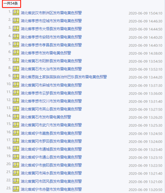 黄冈市应急管理局、市气象台2020年06月09日13时15分发布雷电黄色预警信号:预计未来6小时,黄冈地区局部有雷电活动,雨量30-50毫米,阵风6-8级,请注意防范。