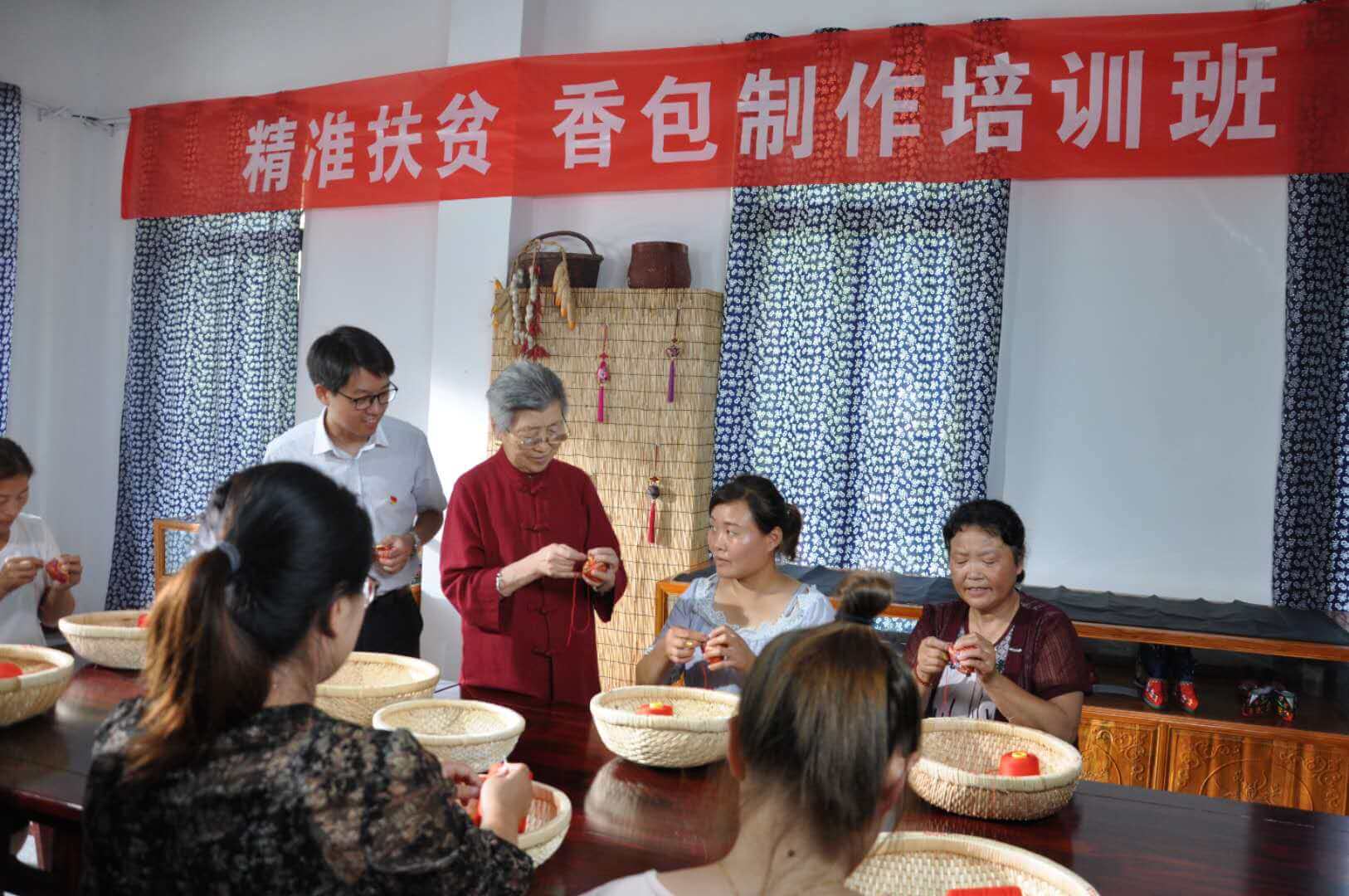 年逾八十的非遗传承人王秀英奶奶开设了“精准扶贫 香包制作培训班”,带领当地妇女制作手工中药香包脱贫致富。