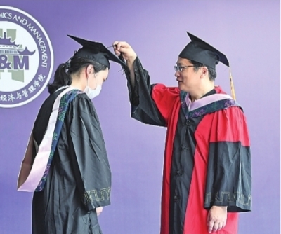上午10时,在武汉大学经济与管理学院院内,和着悠扬的音乐,一群身着学士服的青年男女正在互相拍照,他们刚刚完成了期待已久的毕业典礼。