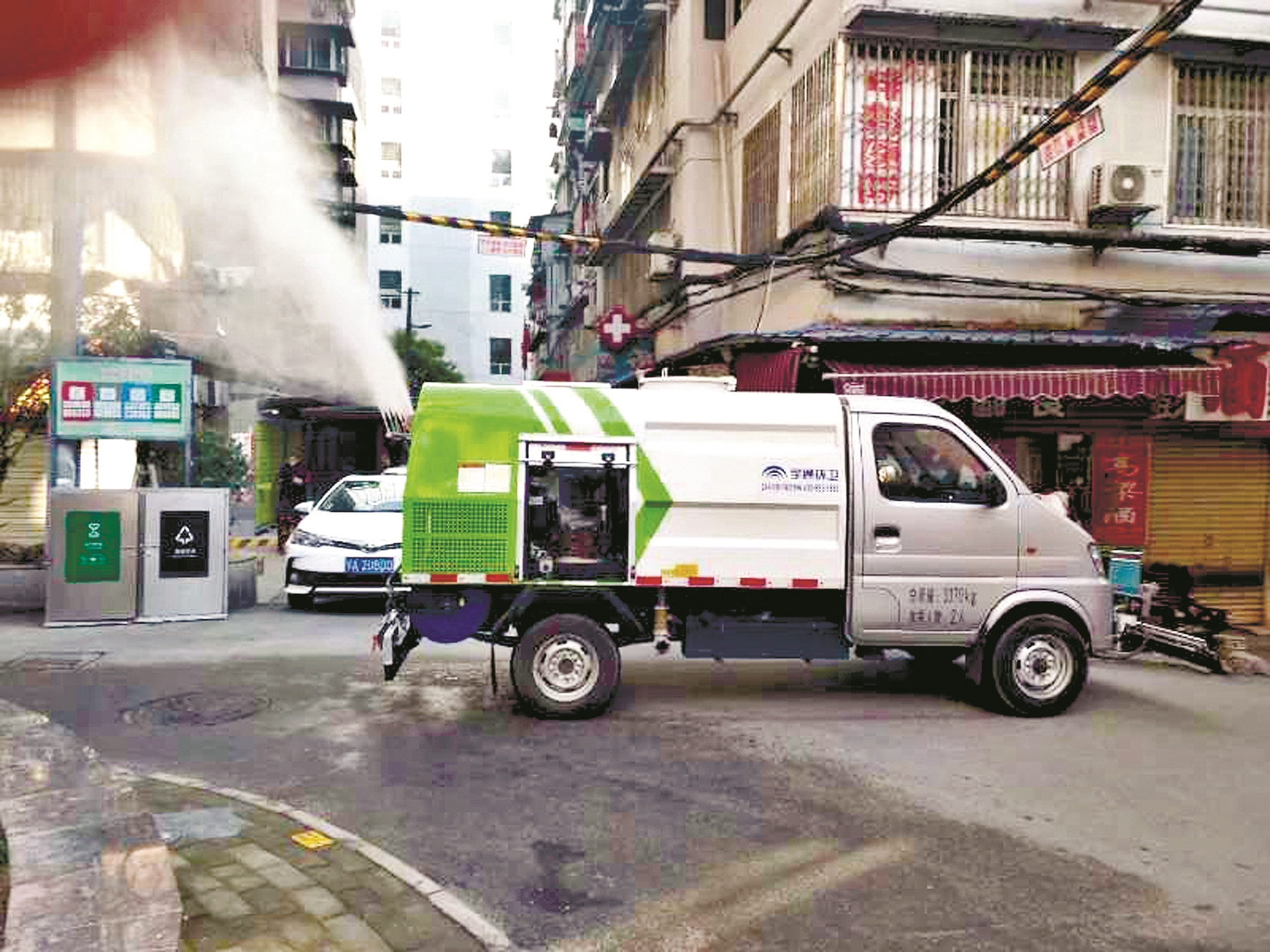 今年2月初,是“战疫”最吃紧的时候。硚口区汉中街环卫所接到消杀任务,一口气买了10台电动喷雾器,但人手又不够。为提高工作效率,环卫工袁红决定将所里的小型道路养护车进行改装,“将朝下喷的喷头,改装到环卫车的水箱顶部,朝天上喷。”