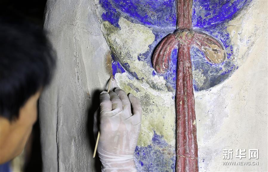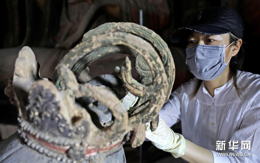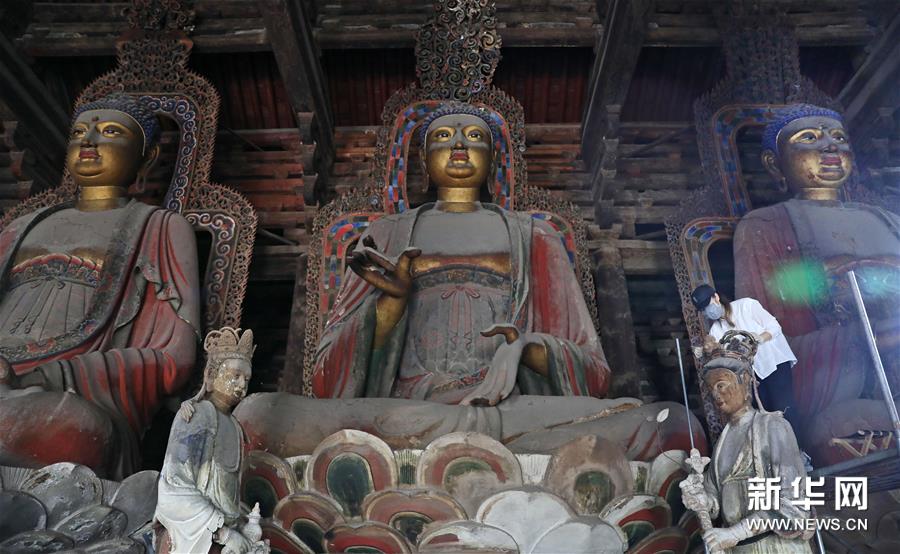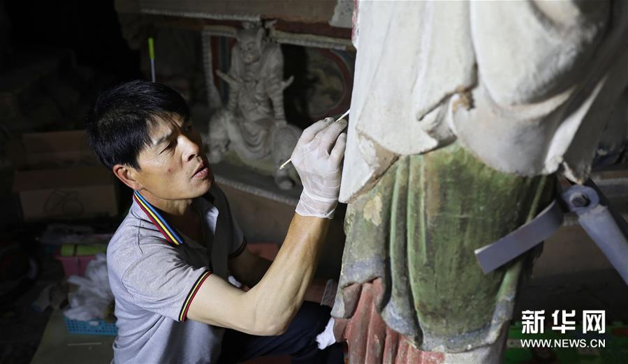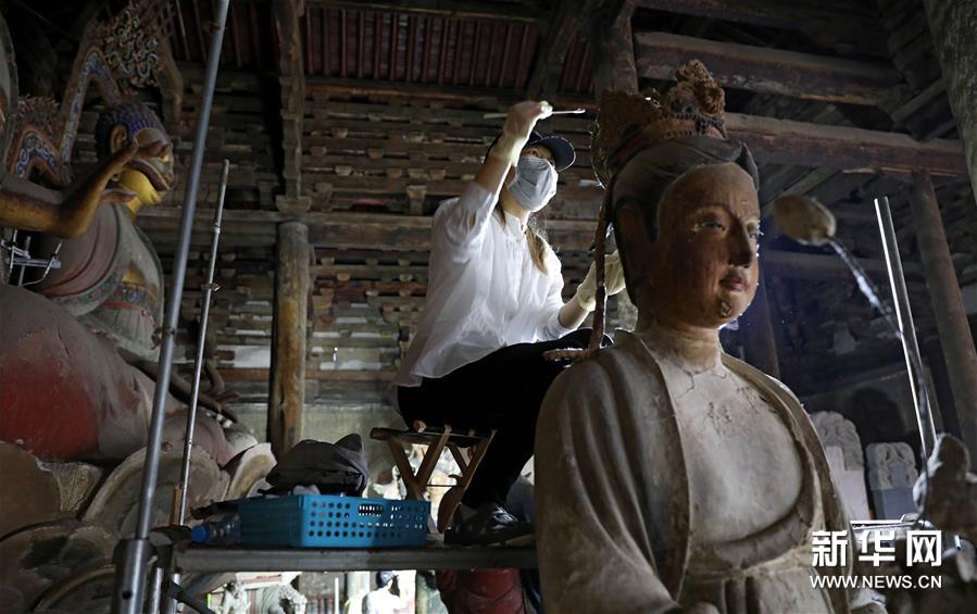 6月8日,工作人员对奉国寺的彩绘泥塑进行保护修复。新华社记者 姚剑锋 摄