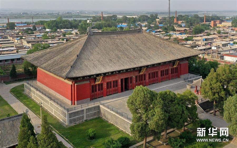 这是奉国寺大雄殿外景(6月8日摄,无人机照片)。日前,建于1020年的辽宁锦州义县奉国寺开始进行彩绘泥塑一期保护修复工程。奉国寺拥有目前世界范围内罕见的大型泥塑彩绘佛像群,于2012年被列入《中国世界文化遗产预备名单》。新华社记者 姚剑锋 摄