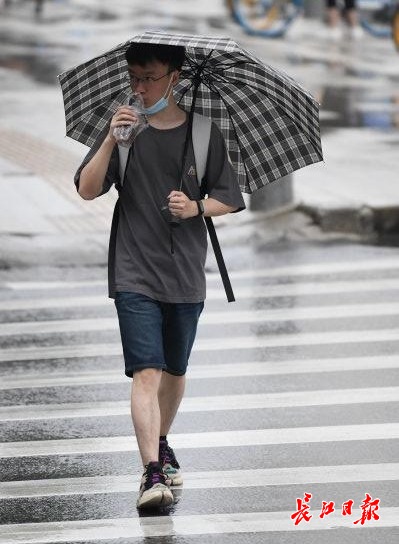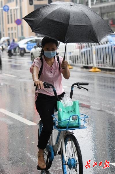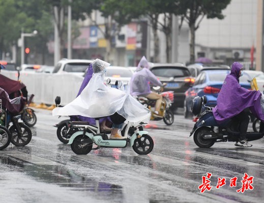 长江日报-长江网6月10日讯 6月10日早上,武汉大雨,在汉口三眼桥北路路口,人们冒雨骑车赶往上班的地方,或者边吃早餐边赶着路。(记者詹松 摄影报道)