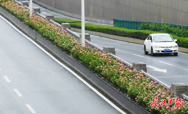 10日,武昌武珞路马路中央的绿化丛里开满了月季,色彩娇艳的花朵扮靓了武汉街头。记者李子云 摄
